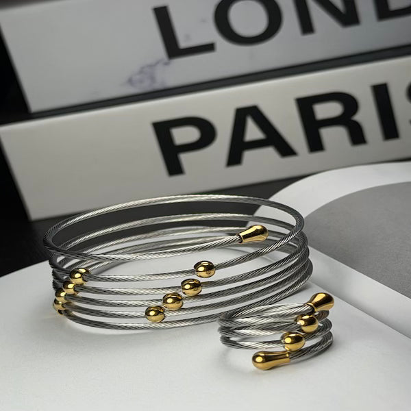 Set en stainless steel con 18K gold plate layered plating, diseñado para un brillo intenso y acabado duradero. Una combinación perfecta de elegancia y modernidad.